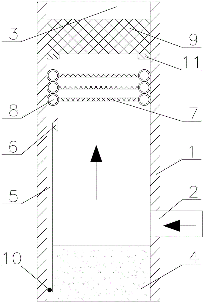 圖中:1、噴淋塔,2、進氣通道,3、出氣口,4、儲水(shuǐ)槽,5、水管,6、噴霧(wù)頭,7、除霧絲網,8、冷凝管,9、炭箱,9-1、紗布,10、鐵球,11、限位塊。
