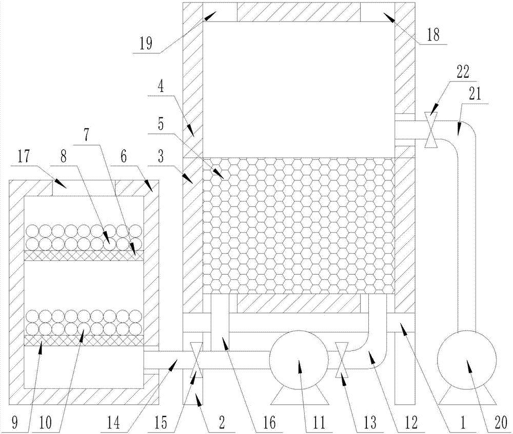 在本實施方(fāng)案中,在設備空閑處設有HB104控製器,控製器的輸出端與(yǔ)一(yī)號電磁閥13、二(èr)號電磁(cí)閥15、三號電磁閥22、一號引風機11、二號引風機20的輸入端(duān)均通過導線相連接,將(jiāng)設備(bèi)連接(jiē)電源,通過控製控製器控製二號電磁閥15、一號引風機11打開,一號電磁閥13、三號電磁閥22、二號引(yǐn)風機20關閉,從廢氣廢氣進氣口17進入矩形箱體6,經過一號網格擋板7上的脫氮劑8祛除廢氣中(zhōng)的氮,經過二(èr)號網格擋板9上的脫硫劑10祛除廢氣中的硫;脫硫劑(jì)10、脫(tuō)氮(dàn)劑8能夠與化肥廠合作提取合成化肥,利用率提(tí)高;在一(yī)號引風機11的作用下通過二號管道(dào)14、三號管道16進入U形槽3,經過陶瓷(cí)蓄熱體5進入到倒U形槽4,倒U形槽4內通過燃料入口18加入燃料(liào),通過進(jìn)風口19加(jiā)入氧氣,將廢氣加熱到(dào)700-900攝氏度使廢氣中的VOC在氧化分解成二氧化碳和水,氧化產生的高溫氣體流經特製的陶瓷蓄熱體5,使陶瓷蓄熱體5升溫而“蓄熱”,此“蓄熱”用於預熱後續進入的有機廢氣,從而節省廢氣升溫的燃料(liào)消耗,可(kě)以控製三號電磁閥22、二號(hào)引風機20的開關控製廢氣處理(lǐ)時間,達到(dào)時間(jiān)後打開三號電磁閥22、二號引風機20,在二號引風機20的作(zuò)用下(xià)將(jiāng)處理後的廢(fèi)氣(qì)排(pái)出;也可以控製一號電磁閥13、一號引風機11打開,二號電磁閥15、三號電磁閥22關閉,將廢(fèi)氣循環引(yǐn)入(rù)U形槽3、倒U形槽4內,可循環處理,多次處(chù)理後廢氣分解效率達到99%以(yǐ)上,節約空間、節省投資費用。